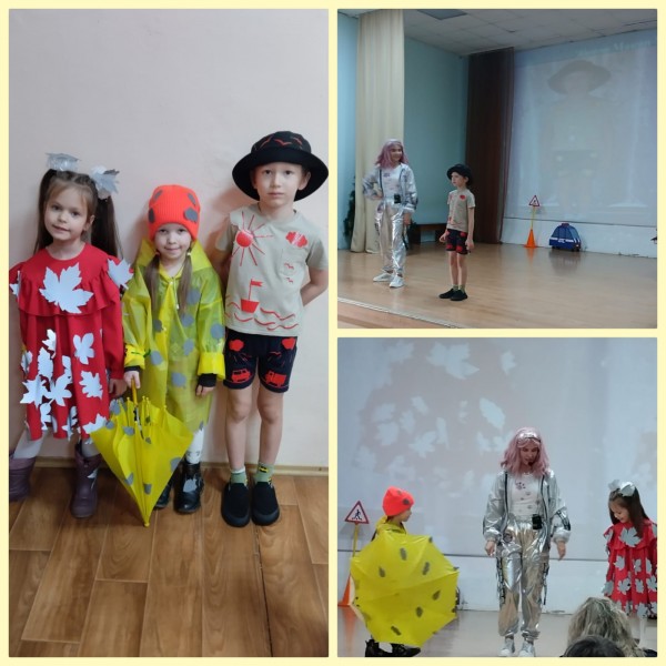 Перминова Анна, Елина София, Жаков Макар. Ребята вместе с родителями и воспитателями подготовили одежду разных сезонов с использованием световозвращающих элементов и с удовольствием продемонстрировали свои костюмы на сцене ДДТ ( дома детского творчества).
